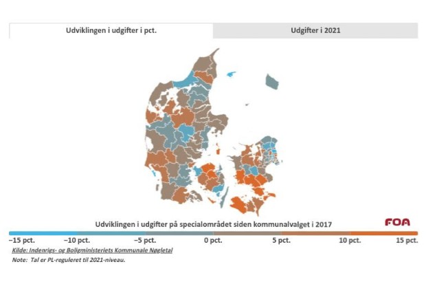 Udgifterne til det specialiserede socialområde i kommunerne er vokset omkring 800 millioner kroner om året de seneste år, samlet set. Men udviklingen fordeler sig skævt. Ser man på udgiften per borger, stiger den i 59 kommuner i perioden 2018 til 2021. I 39 kommuner falder udgifterne per borger.