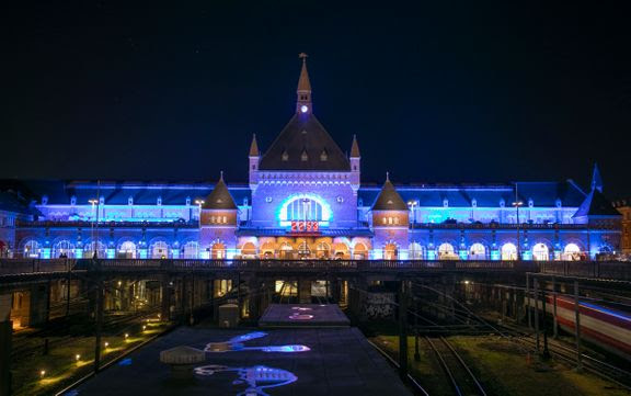 DSB Københavns Hovedbanegård lyser blåt i anledning af Børnenes Dag. Foto: Bjarke Ørsted